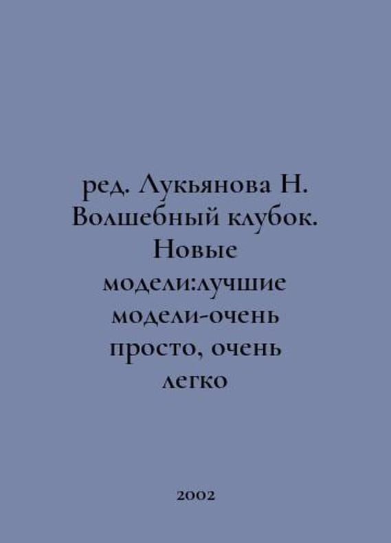 ed. Lukyanov N. Magical tangle. New models: best models - very simple, very easy In Russian /red. Lukyanova N. Volshebnyy klubok. Novye modeli:luchshie modeli-ochen prosto, ochen legko Moscow ACT 2002..You are welcome to reach out to us for a detailed description of the copies currently available. Delivery of this book may take longer than usual including extended processing and pre-shipping time, no expedited shipping is available. Please advise us if you have a set date or a deadline to receive your order. SKUalb44819a2a317b1a61