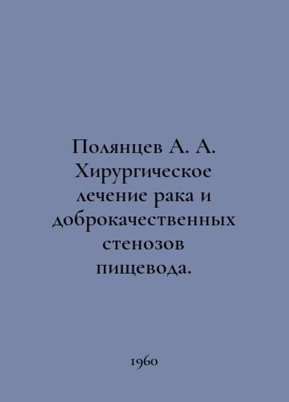 Polyantsev A. A. Surgical treatment of cancer and benign esophageal stenosis. In Russian /Polyantsev A. A. Khirurgicheskoe lechenie raka i dobrokachestvennykh stenozov pishchevoda. Monograph. Edition 2, revised and supplemented. Stalingrad. Stalingrad Book Publishing House. 1960..You are welcome to reach out to us for a detailed description of the copies currently available. Delivery of this book may take longer than usual including extended processing and pre-shipping time, no expedited shipping is available. Please advise us if you have a set date or a deadline to receive your order. SKUalb45784e54a678f466