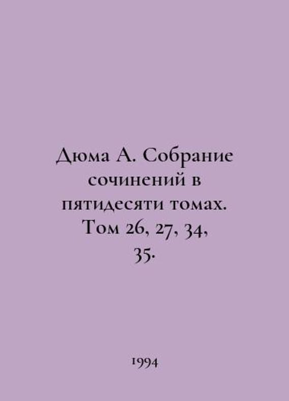 Dumas A. A collection of essays in fifty volumes. Volumes 26, 27, 34, 35. In Russian /Dyuma A. Sobranie sochineniy v pyatidesyati tomakh. Tom 26, 27, 34, 35. M. Art-Business Center. 1994-1999. You are welcome to reach out to us for a detailed description of the copies currently available. Delivery of this book may take longer than usual including extended processing and pre-shipping time, no expedited shipping is available. Please advise us if you have a set date or a deadline to receive your order.SKUalb4597cec8ca0ec3ec