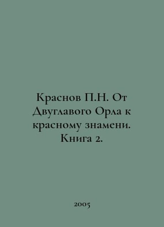 N. Krasnov From Two-Headed Eagle to Red Banner. Book 2. In Russian /Krasnov N. Ot Dvuglavogo Orla k krasnomu znameni. Kniga 2. Series: Belaya Rossiya M. AIRIS PRESS. 2005. You are welcome to reach out to us for a detailed description of the copies currently available. Delivery of this book may take longer than usual including extended processing and pre-shipping time, no expedited shipping is available. Please advise us if you have a set date or a deadline to receive your order.SKUalb45982e644549ada9
