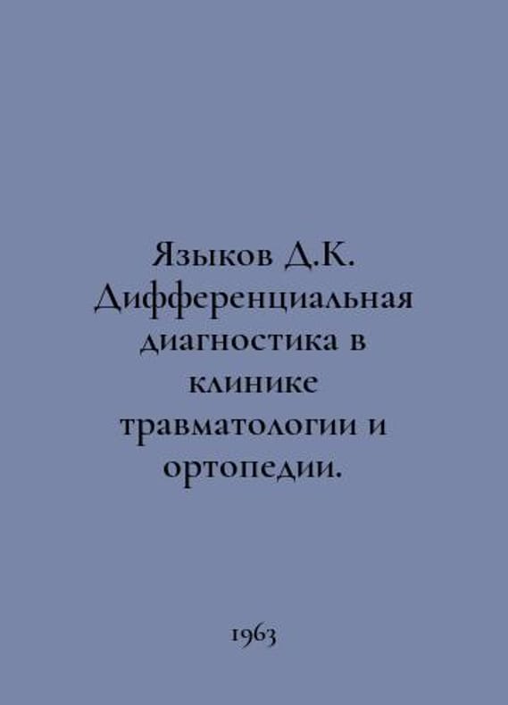 D.K. Languages Differential Diagnostics in the Clinic of Traumatology and Orthopaedic Medicine. In Russian /Yazykov D.K. Differentsialnaya diagnostika v klinike travmatologii i ortopedii. M. MEDGIZ 1963..You are welcome to reach out to us for a detailed description of the copies currently available. Delivery of this book may take longer than usual including extended processing and pre-shipping time, no expedited shipping is available. Please advise us if you have a set date or a deadline to receive your order. SKUalb477bc09178c262cd