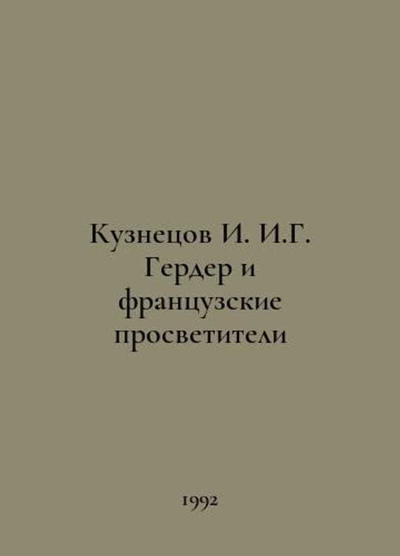 Kuznetsov I. I. G. Gerder and French Educators In Russian /Kuznetsov I. I.G. Gerder i frantsuzskie prosvetiteli M 1992. You are welcome to reach out to us for a detailed description of the copies currently available. Delivery of this book may take longer than usual including extended processing and pre-shipping time, no expedited shipping is available. Please advise us if you have a set date or a deadline to receive your order.SKUalb478788dd861db043