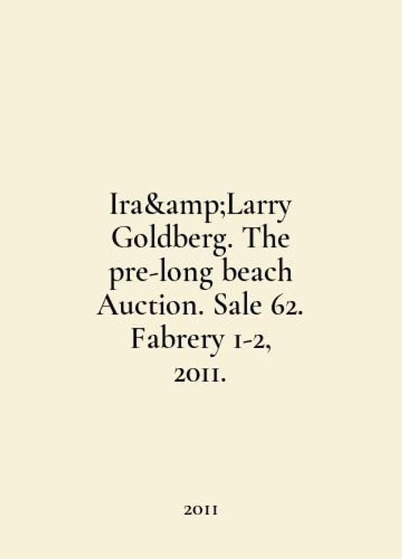"Ira Larry Goldberg. The pre-long beach Auction. Sale 62. Fabrery 1-2, 2011. In English /Ira&Larry Goldberg. The pre-long beach Auction. Sale 62. Fabrery 1-2, 2011. Auction catalogue. Los Angeles, 2011..You are welcome to reach out to us for a detailed description of the copies currently available. Delivery of this book may take longer than usual including extended processing and pre-shipping time, no expedited shipping is available. Please advise us if you have a set date or a deadline to receive your order. SKUalb4799cdd846c68f30"