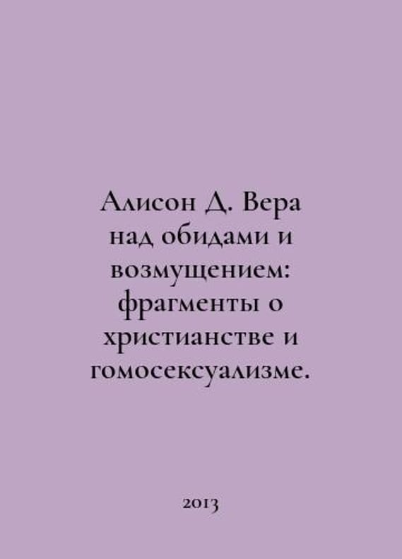 Alison D. Faith Over Grief and Indignation: Fragments About Christianity and Homosexuality. In Russian /Alison D. Vera nad obidami i vozmushcheniem: fragmenty o khristianstve i gomoseksualizme. M BBI. 2013..You are welcome to reach out to us for a detailed description of the copies currently available. Delivery of this book may take longer than usual including extended processing and pre-shipping time, no expedited shipping is available. Please advise us if you have a set date or a deadline to receive your order. SKUalb49803839f1f0d979