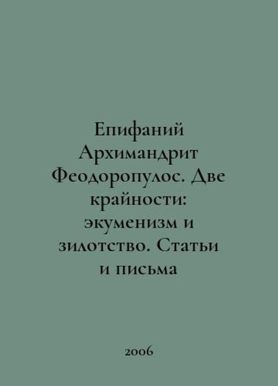 Epiphanius Archimandrite Theodoropoulos. Two extremes: ecumenism and silotry. Articles and letters In Russian /Epifaniy Arkhimandrit Feodoropulos. Dve kraynosti: ekumenizm i zilotstvo. Stati i pisma M. Holy Mountain 2006..You are welcome to reach out to us for a detailed description of the copies currently available. Delivery of this book may take longer than usual including extended processing and pre-shipping time, no expedited shipping is available. Please advise us if you have a set date or a deadline to receive your order. SKUalb4b6318c69880751e