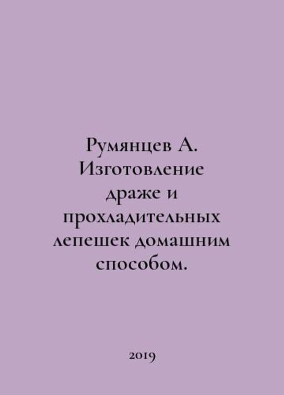 Rumyantsev A. Making draget and cold tortillas at home. In Russian /Rumyantsev A. Izgotovlenie drazhe i prokhladitelnykh lepeshek domashnim sposobom. Moscow Publishing House V. Sekachev 2019. You are welcome to reach out to us for a detailed description of the copies currently available. Delivery of this book may take longer than usual including extended processing and pre-shipping time, no expedited shipping is available. Please advise us if you have a set date or a deadline to receive your order.SKUalb5a536f0452b2dde8