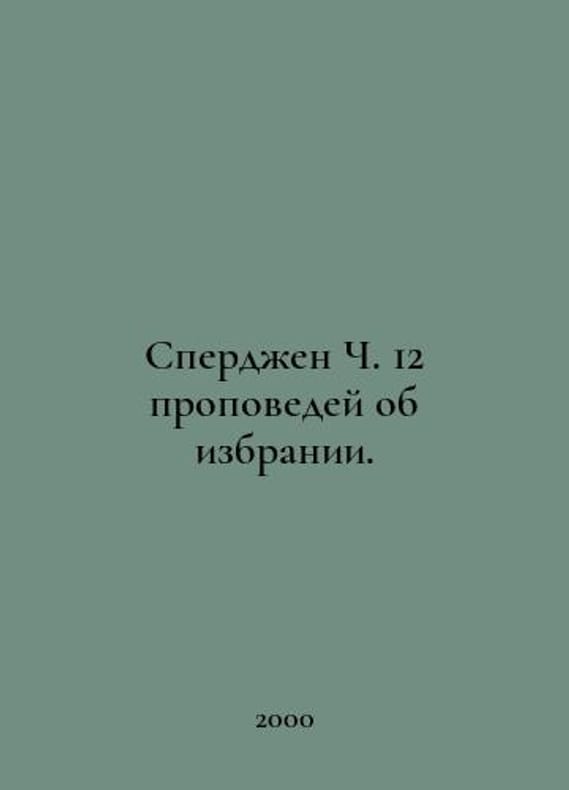 Spurgeon C. 12 sermons on election. In Russian /Sperdzhen Ch. 12 propovedey ob izbranii. Belarus, Minsk. Publishing House of the Testament of Christ Church. 2000. You are welcome to reach out to us for a detailed description of the copies currently available. Delivery of this book may take longer than usual including extended processing and pre-shipping time, no expedited shipping is available. Please advise us if you have a set date or a deadline to receive your order.SKUalb5b5d34396fdd99e3