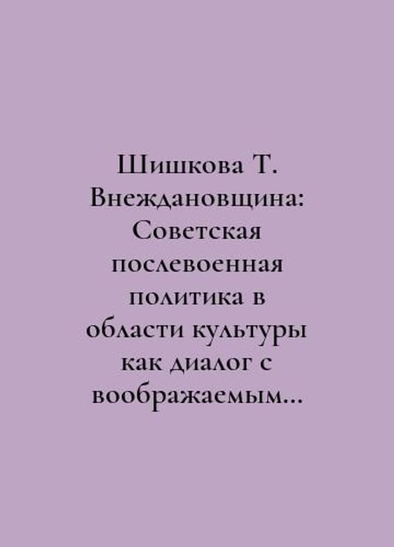 Shishkova T. Vnezhdanovshchina: Soviet postwar cultural policy as a dialogue with the imaginary West. In Russian /Shishkova T. Vnezhdanovshchina: Sovetskaya poslevoennaya politika v oblasti kultury kak dialog s voobrazhaemym Zapadom. Library of the journal: The Untouchable Reserve of M. New Literary Review 2023. 384 You are welcome to reach out to us for a detailed description of the copies currently available. Delivery of this book may take longer than usual including extended processing and pre-shipping time, no expedited shipping is available. Please advise us if you have a set date or a deadline to receive your order.SKUalb5cc5d79cc18f011c