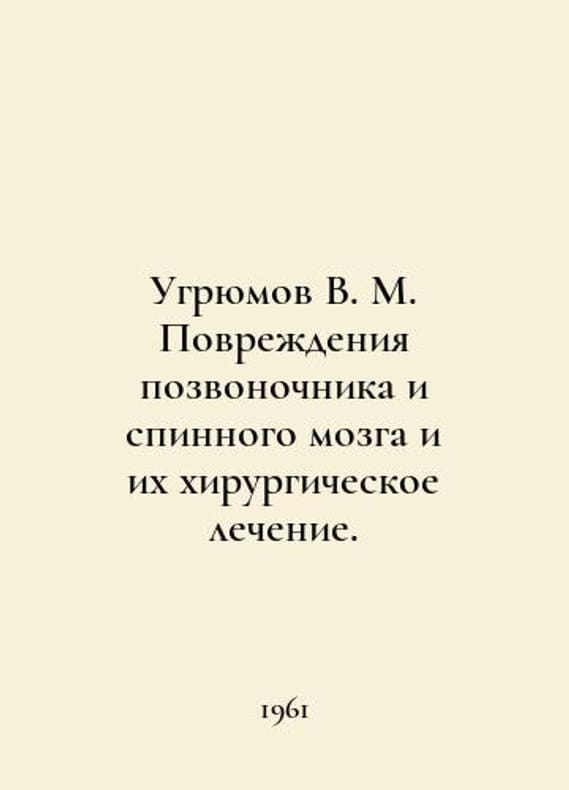 Ugriumov V. M. Spinal and spinal cord injuries and their surgical treatment. In Russian /Ugryumov V. M. Povrezhdeniya pozvonochnika i spinnogo mozga i ikh khirurgicheskoe lechenie. Monograph. M. Medgiz. 1961..You are welcome to reach out to us for a detailed description of the copies currently available. Delivery of this book may take longer than usual including extended processing and pre-shipping time, no expedited shipping is available. Please advise us if you have a set date or a deadline to receive your order. SKUalb6123637a418becfb
