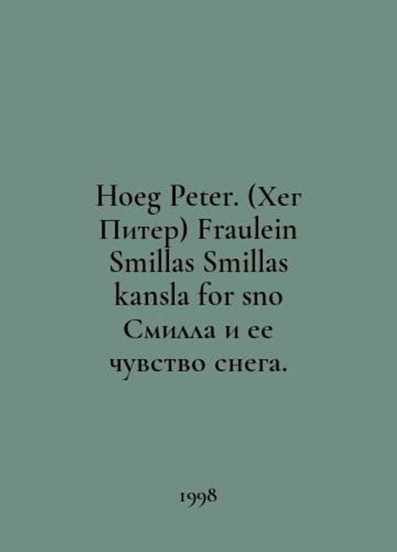 Hoeg Peter. Fraulein Smillas Smillas kansla for sno Smilla and her sense of snow. In Russian /Hoeg Peter. (Kheg Piter) Fraulein Smillas Smillas kansla for sno Smilla i ee chuvstvo snega. In Danish. Bokforlaget Pan 1998..You are welcome to reach out to us for a detailed description of the copies currently available. Delivery of this book may take longer than usual including extended processing and pre-shipping time, no expedited shipping is available. Please advise us if you have a set date or a deadline to receive your order. SKUalb6232b6c0de9c4b01