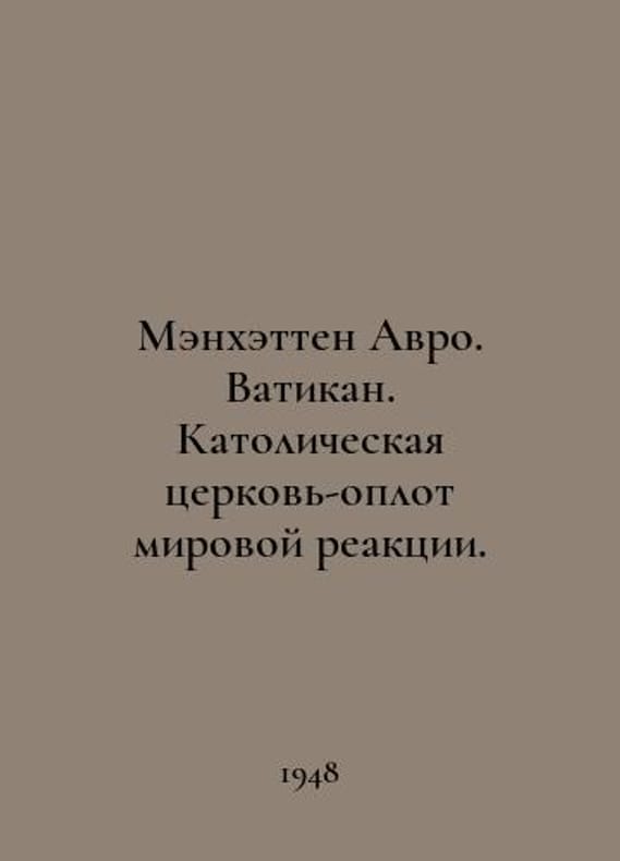 Manhattan Avro. Vatican. The Catholic Church, the bastion of world reaction. In Russian /Menkhetten Avro. Vatikan. Katolicheskaya tserkov-oplot mirovoy reaktsii. Translated from English. Edited by I. Tikhomirova.You are welcome to reach out to us for a detailed description of the copies currently available. SKUalb62439675808ccda6.
