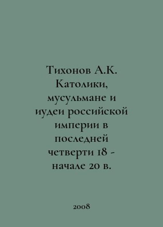 Tikhonov A.K. Catholics, Muslims, and Jews of the Russian Empire in the Last Quarter of the 18th - Early 20th Century In Russian /Tikhonov A.K. Katoliki, musulmane i iudei rossiyskoy imperii v posledney chetverti 18 - nachale 20 v. 978-5-288-04293-5 SPBGU 2008. You are welcome to reach out to us for a detailed description of the copies currently available. Delivery of this book may take longer than usual including extended processing and pre-shipping time, no expedited shipping is available. Please advise us if you have a set date or a deadline to receive your order.SKUalb6778916115dc5da7