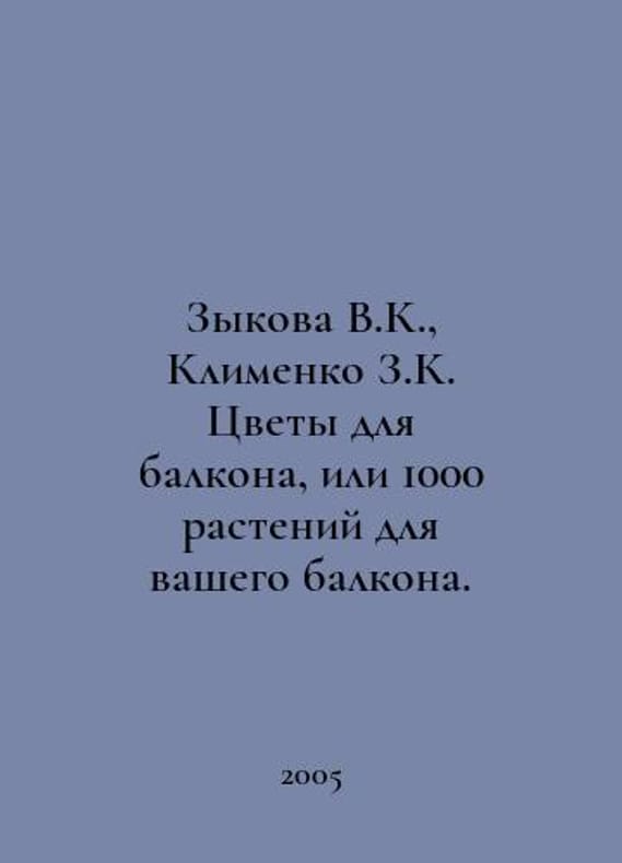Zykova V.K., Klimenko Z.K. Flowers for the balcony, or 1000 plants for your balcony. In Russian /Zykova V.K., Klimenko Z.K. Tsvety dlya balkona, ili 1000 rasteniy dlya vashego balkona. Illustrated reference book. M. Fiton and. 2005.You are welcome to reach out to us for a detailed description of the copies currently available. SKUalb685d942767fecab5.