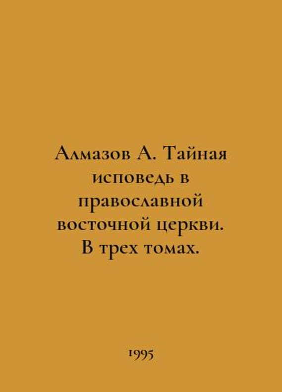 Almazov A. Secret Confession in the Orthodox Eastern Church. In three volumes. In Russian /Almazov A. Taynaya ispoved v pravoslavnoy vostochnoy tserkvi. V trekh tomakh. Volume 3 of the Appendix. M. Pilgrim 1995..You are welcome to reach out to us for a detailed description of the copies currently available. Delivery of this book may take longer than usual including extended processing and pre-shipping time, no expedited shipping is available. Please advise us if you have a set date or a deadline to receive your order. SKUalb687013b6b6582ade