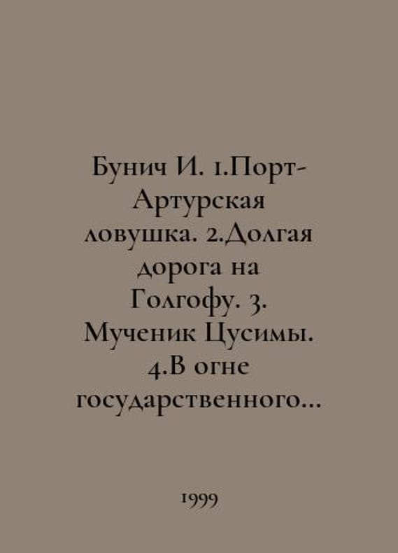 Bunich I. 1. Port Arthur Trap. 2. The Long Road to Golgotha. 3. Tsushima Martyr. 4. In the Fire of the State Cataclysm. In Russian /Bunich I. 1.Port-Arturskaya lovushka. 2.Dolgaya doroga na Golgofu. 3. Muchenik Tsusimy. 4.V ogne gosudarstvennogo kataklizma. Tetralogy. St. Petersburg Oblik, Zenit. 1999-2000. You are welcome to reach out to us for a detailed description of the copies currently available. Delivery of this book may take longer than usual including extended processing and pre-shipping time, no expedited shipping is available. Please advise us if you have a set date or a deadline to receive your order.SKUalb6bb31956b4a483a4