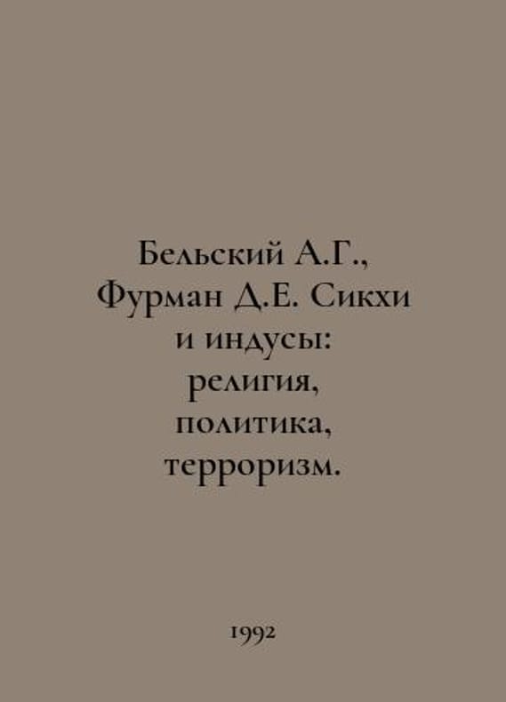 Belsky A.G., Furman D.E. Sikhs and Hindus: Religion, Politics, Terrorism. In Russian /Belskiy A.G., Furman D.E. Sikkhi i indusy: religiya, politika, terrorizm. Chief Editor of Oriental Literature M. Nauka. 1992. You are welcome to reach out to us for a detailed description of the copies currently available. Delivery of this book may take longer than usual including extended processing and pre-shipping time, no expedited shipping is available. Please advise us if you have a set date or a deadline to receive your order.SKUalb6f24b135a63bfff0