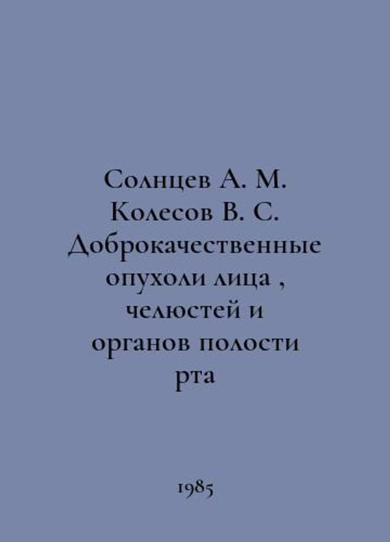 Solntsev A. M. Kolesov V. S. Benign tumors of the face, jaws and organs of the mout In Russian /Solntsev A. M. Kolesov V. S. Dobrokachestvennye opukholi litsa , chelyustey i organov polosti rta Kiev Health 1985..You are welcome to reach out to us for a detailed description of the copies currently available. Delivery of this book may take longer than usual including extended processing and pre-shipping time, no expedited shipping is available. Please advise us if you have a set date or a deadline to receive your order. SKUalb6faf9162e74d14cb