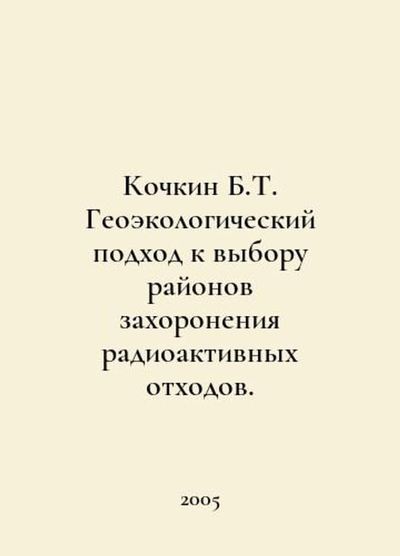 Kochkin B.T. Geo-ecological Approach to Selection of Radioactive Waste Disposal Areas. In Russian /Kochkin B.T. Geoekologicheskiy podkhod k vyboru rayonov zakhoroneniya radioaktivnykh otkhodov. M. Science 2005..You are welcome to reach out to us for a detailed description of the copies currently available. Delivery of this book may take longer than usual including extended processing and pre-shipping time, no expedited shipping is available. Please advise us if you have a set date or a deadline to receive your order. SKUalb70306ff788646b04