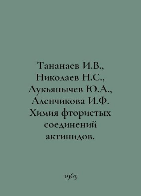 Tananaev I.V., Nikolaev N.S., Lukyanychev Yu.A., Alenchikova I.F. Chemistry of fluoride compounds of actinides. In Russian /Tananaev I.V., Nikolaev N.S., Lukyanychev Yu.A., Alenchikova I.F. Khimiya ftoristykh soedineniy aktinidov. M. Academy of Sciences 1963..You are welcome to reach out to us for a detailed description of the copies currently available. Delivery of this book may take longer than usual including extended processing and pre-shipping time, no expedited shipping is available. Please advise us if you have a set date or a deadline to receive your order. SKUalb7095d4d5a3369c76