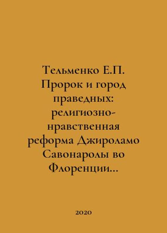 Telmenko H.E. The Prophet and the City of the Righteous: The Religious and Moral Reform of Girolamo Savonarola in late 15th Century Florence In Russian /Telmenko E. Prorok i gorod pravednykh: religiozno-nravstvennaya reforma Dzhirolamo Savonaroly vo Florentsii kontsa XV v. Monograph. Stavropol: SCFU 2020. You are welcome to reach out to us for a detailed description of the copies currently available. Delivery of this book may take longer than usual including extended processing and pre-shipping time, no expedited shipping is available. Please advise us if you have a set date or a deadline to receive your order.SKUalb720be0b7b8025349