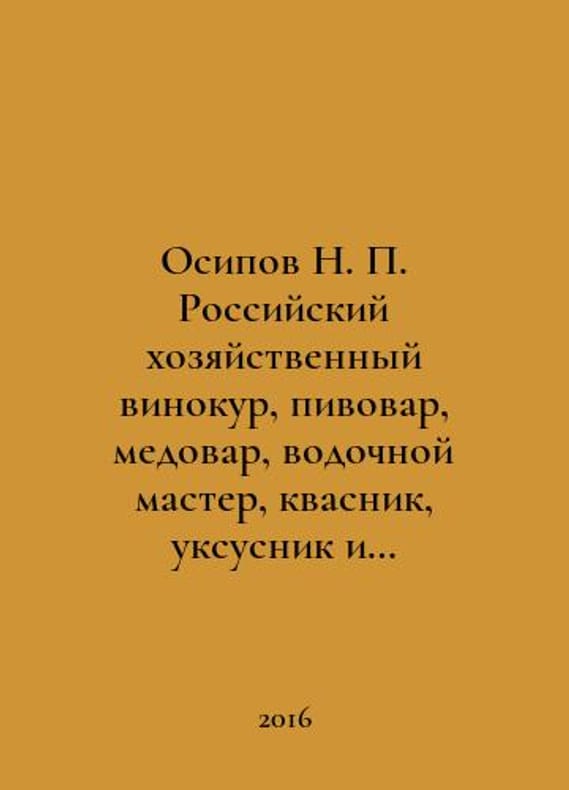 Osipov N. Russian economic distiller, brewer, honeymaker, vodka master, alum, vinegar, and busker In Russian /Osipov N. Rossiyskiy khozyaystvennyy vinokur, pivovar, medovar, vodochnoy master, kvasnik, uksusnik i pogrebshchik Moscow Publishing House V. Sekachev 2016. You are welcome to reach out to us for a detailed description of the copies currently available. Delivery of this book may take longer than usual including extended processing and pre-shipping time, no expedited shipping is available. Please advise us if you have a set date or a deadline to receive your order.SKUalb72842594e01c813b