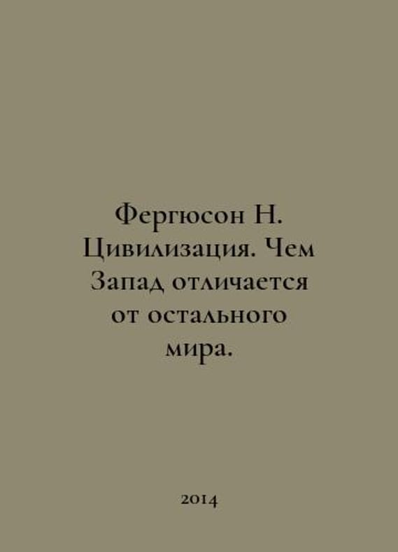 Ferguson N. Civilization: How the West is different from the rest of the world. In Russian /Fergyuson N. Tsivilizatsiya. Chem Zapad otlichaetsya ot ostalnogo mira. M. ACT. 2014 year. You are welcome to reach out to us for a detailed description of the copies currently available. SKUalb74adcb959aa39908.