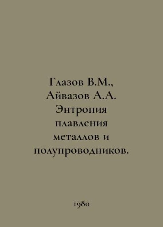 V.M. Glazov, A.A. Ayvazov Entropy of Melting Metals and Semiconductors. In Russian /Glazov V.M., Ayvazov A.A. Entropiya plavleniya metallov i poluprovodnikov. Moscow Metallurgiya Publishing House. 1980..You are welcome to reach out to us for a detailed description of the copies currently available. Delivery of this book may take longer than usual including extended processing and pre-shipping time, no expedited shipping is available. Please advise us if you have a set date or a deadline to receive your order. SKUalb74b3dcc58e13ad5c
