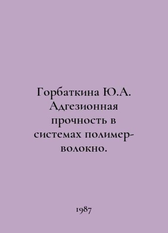 Gorbatkina Yu.A. Adhesion strength in polymer-fiber systems. In Russian /Gorbatkina Yu.A. Adgezionnaya prochnost v sistemakh polimer-volokno. M. Chemiya 1987..You are welcome to reach out to us for a detailed description of the copies currently available. Delivery of this book may take longer than usual including extended processing and pre-shipping time, no expedited shipping is available. Please advise us if you have a set date or a deadline to receive your order. SKUalb76bb7dcb743b512f