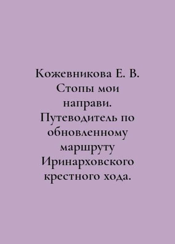 E. V. Kozhevnikovas My Foot Directs. A Guide to the Renewed Route of the Irinarkhov Cross procession. In Russian /Kozhevnikova E. V. Stopy moi napravi. Putevoditel po obnovlennomu marshrutu Irinarkhovskogo krestnogo khoda. Borisoglebsky: Edition of the Boriso-Glebsky Monastery Museum, 2023, 184You are welcome to reach out to us for a detailed description of the copies currently available. Delivery of this book may take longer than usual including extended processing and pre-shipping time, no expedited shipping is available. Please advise us if you have a set date or a deadline to receive your order. SKUalb789db8275d9734c4