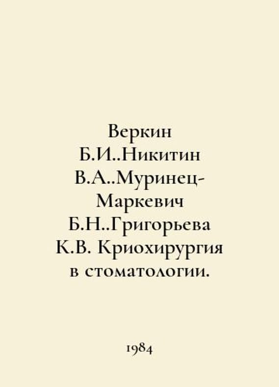 Verkin B.I.. Nikitin V.A. Murinets-Markevich B.N.. Grigorieva K.V. Cryosurgery in dentistry. In Russian /Verkin B.I..Nikitin V.A..Murinets-Markevich B.N..Grigoreva K.V. Kriokhirurgiya v stomatologii. Kyiv Naukova Duma 1984..You are welcome to reach out to us for a detailed description of the copies currently available. Delivery of this book may take longer than usual including extended processing and pre-shipping time, no expedited shipping is available. Please advise us if you have a set date or a deadline to receive your order. SKUalb7c7d136ff1b62961