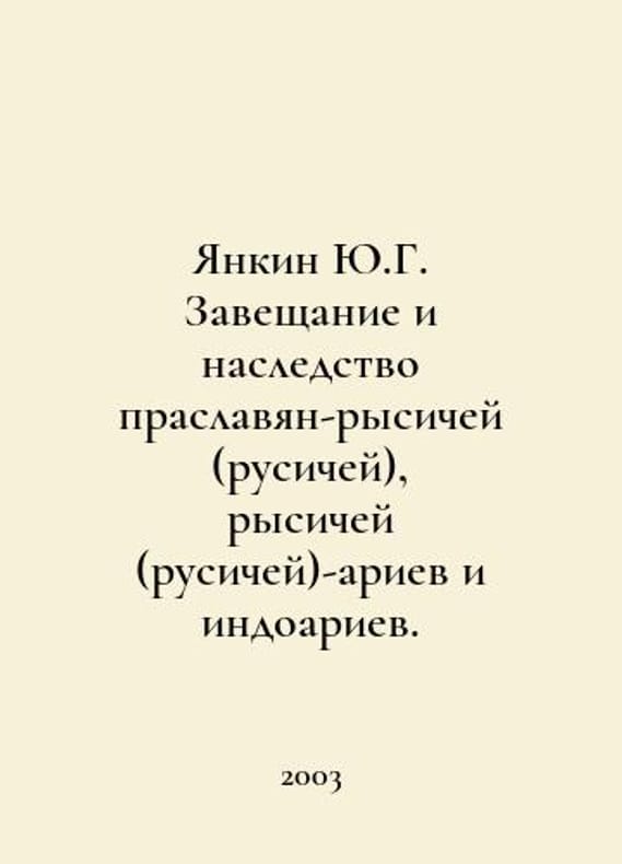 Yankin Y.G. Testament and inheritance of Pro-Slavic lynx (Rusich), Lynx (Rusich) -Aryans and Indoarians. In Russian /Yankin Yu.G. Zaveshchanie i nasledstvo praslavyan-rysichey (rusichey), rysichey (rusichey)-ariev i indoariev. National Security and Geopolitics of Russia. Special Issue # 3 (9). M. National Security 2003.You are welcome to reach out to us for a detailed description of the copies currently available. SKUalb7e39d278e58abf64.
