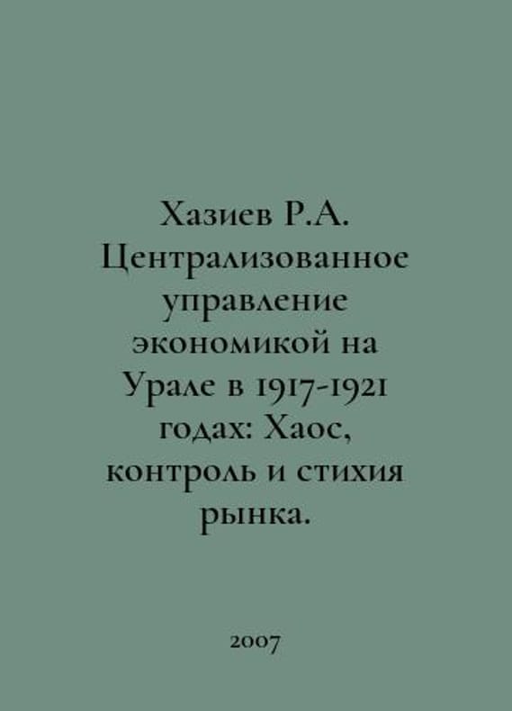 R.A. Khaziev Central Economic Management in the Urals in 1917-1921: Chaos, Control, and Elements of the Market. In Russian /Khaziev R.A. Tsentralizovannoe upravlenie ekonomikoy na Urale v 1917-1921 godakh: Khaos, kontrol i stikhiya rynka. M., ROSSPEN, 2007.You are welcome to reach out to us for a detailed description of the copies currently available. SKUalb81abaae273562be4.