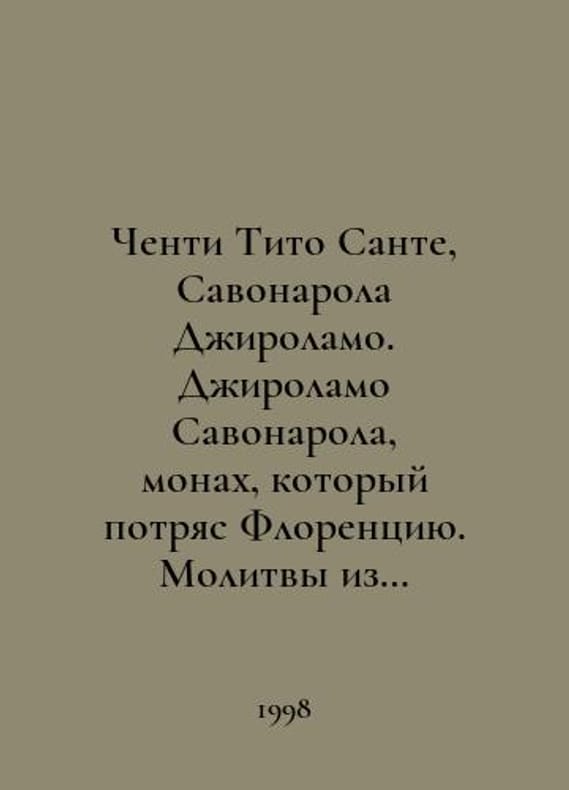 Chenti Tito Sante, Savonarola Girolamo. Girolamo Savonarola, the monk who shook Florence. Prayers from prison In Russian /Chenti Tito Sante, Savonarola Dzhirolamo. Dzhirolamo Savonarola, monakh, kotoryy potryas Florentsiyu. Molitvy iz temnitsy M. Franciscans 1998. You are welcome to reach out to us for a detailed description of the copies currently available. Delivery of this book may take longer than usual including extended processing and pre-shipping time, no expedited shipping is available. Please advise us if you have a set date or a deadline to receive your order.SKUalb81fe4f6500cb5de8