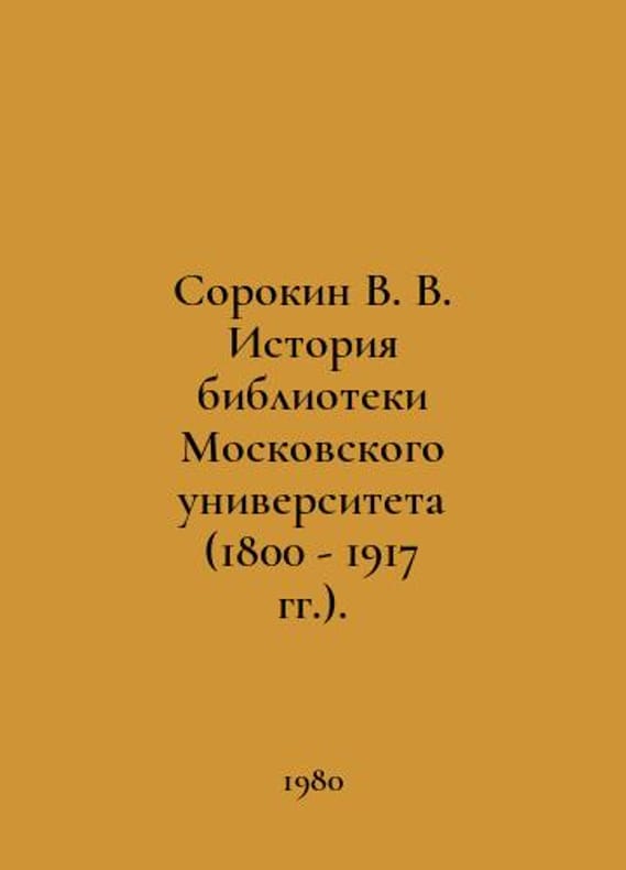 Sorokin V.V. History of the Moscow University Library (1800-1917) In Russian /Sorokin V.V. Istoriya biblioteki Moskovskogo universiteta (1800-1917 gg.) Moscow State University Publishing House 1980. 254 p. We have thousands of titles and often several copies of each title may be available. Please feel free to contact us for a detailed description of the copies available. SKUalbfcf62c505125d1bc.