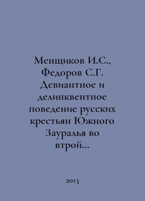 Menshchikov I. S., Fedorov S. G. Deviant and Delinquent Behavior of Russian Peasants of Southern Zaural Region in the Third Half of the 19th - Early 20th Century In Russian /Menshchikov I.S., Fedorov S.G. Deviantnoe i delinkventnoe povedenie russkikh krestyan Yuzhnogo Zauralya vo vtroy polovine XIX - nachale XX v. Monograph. Scientific Editor of Pundani V.V. Kurgan KSU 2013. You are welcome to reach out to us for a detailed description of the copies currently available. Delivery of this book may take longer than usual including extended processing and pre-shipping time, no expedited shipping is available. Please advise us if you have a set date or a deadline to receive your order.SKUalb891684746c068126