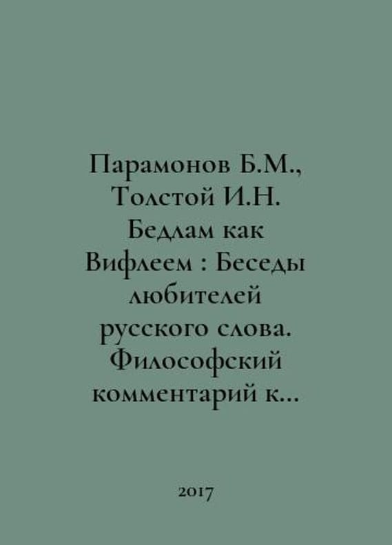 Paramonov B.M., Tolstoy I.N. Bedlam as Bethlehem: Conversations of lovers of the Russian word. A philosophical commentary on Russian literature. In Russian /Paramonov B.M., Tolstoy I.N. Bedlam kak Vifleem: Besedy lyubiteley russkogo slova. Filosofskiy kommentariy k russkoy literature. Moscow. Delo RANEPA Publishing House. 2017 year. You are welcome to reach out to us for a detailed description of the copies currently available. Delivery of this book may take longer than usual including extended processing and pre-shipping time, no expedited shipping is available. Please advise us if you have a set date or a deadline to receive your order.SKUalb8962aad86e05c1c3
