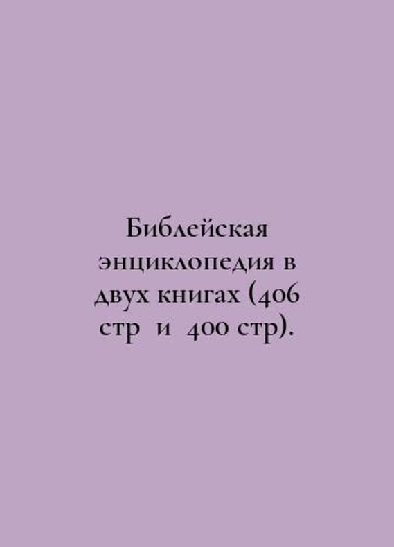 A biblical encyclopedia in two books (406 pages and 400 pages). In Russian /Bibleyskaya entsiklopediya v dvukh knigakh (406 str i 400 str). Reproduction of the 1891 edition..You are welcome to reach out to us for a detailed description of the copies currently available. Delivery of this book may take longer than usual including extended processing and pre-shipping time, no expedited shipping is available. Please advise us if you have a set date or a deadline to receive your order. SKUalb89a89ee44f0cc3b7