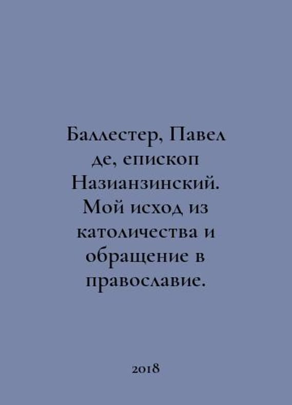 Ballester, Paul de, Bishop of Nazianzin. My conversion from Catholicism to Orthodoxy. In Russian /Ballester, Pavel de, episkop Nazianzinskiy. Moy iskhod iz katolichestva i obrashchenie v pravoslavie. Mr. Maheras of Cyprus. 2018..You are welcome to reach out to us for a detailed description of the copies currently available. Delivery of this book may take longer than usual including extended processing and pre-shipping time, no expedited shipping is available. Please advise us if you have a set date or a deadline to receive your order. SKUalb8b0e0b652593d009