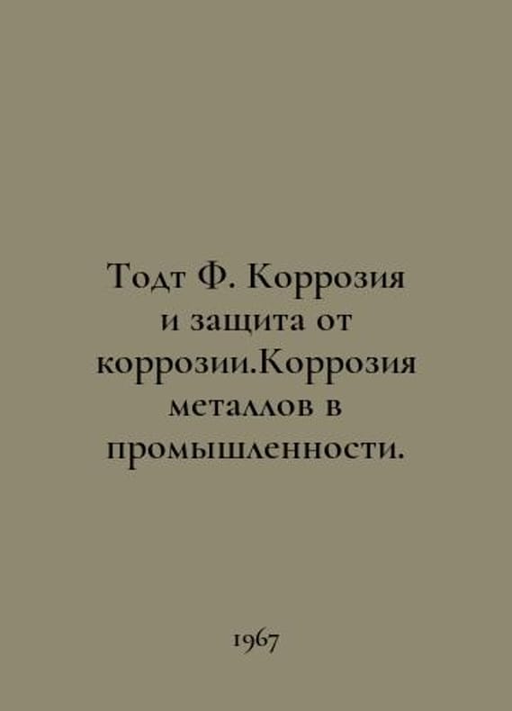 Todt F. Corrosion and corrosion protection. Corrosion of metals in industry. In Russian /Todt F. Korroziya i zashchita ot korrozii.Korroziya metallov v promyshlennosti. Translated by M. Chemiya 1967..You are welcome to reach out to us for a detailed description of the copies currently available. Delivery of this book may take longer than usual including extended processing and pre-shipping time, no expedited shipping is available. Please advise us if you have a set date or a deadline to receive your order. SKUalb8c8162b1d07e0799