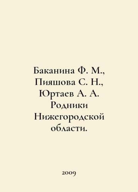Bakanina F. M., Piyashova S. N., Yurtaev A. A. Springs of Nizhny Novgorod Region In Russian /Bakanina F. M., Piyashova S. N., Yurtaev A. A. Rodniki Nizhegorodskoy oblasti. Monograph. Nizhny Novgorod: Edition of the PLO, 2009.You are welcome to reach out to us for a detailed description of the copies currently available. SKUalb8c8768c4eba2b9a5.