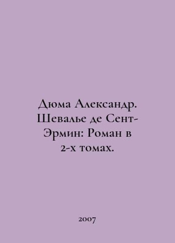 Dumas Alexandre Chevalier de Saint-Hermine: A Novel in Two Volumes. In Russian /Dyuma Aleksandr. Shevale de Sent-Ermin: Roman v 2-kh tomakh. This edition is the first separate publication of the novel in Russian. Translated from French by M.Yu. Rozhnova, T.N. Paskharyan, E.V. Trynkina, N.E. Kudryavtseva, A.Ya. Mailyan. Restored text, foreword and notes by Claude Chopp. M Geleos. 2007. You are welcome to reach out to us for a detailed description of the copies currently available. Delivery of this book may take longer than usual including extended processing and pre-shipping time, no expedited shipping is available. Please advise us if you have a set date or a deadline to receive your order.SKUalb93838bb5d2eac953
