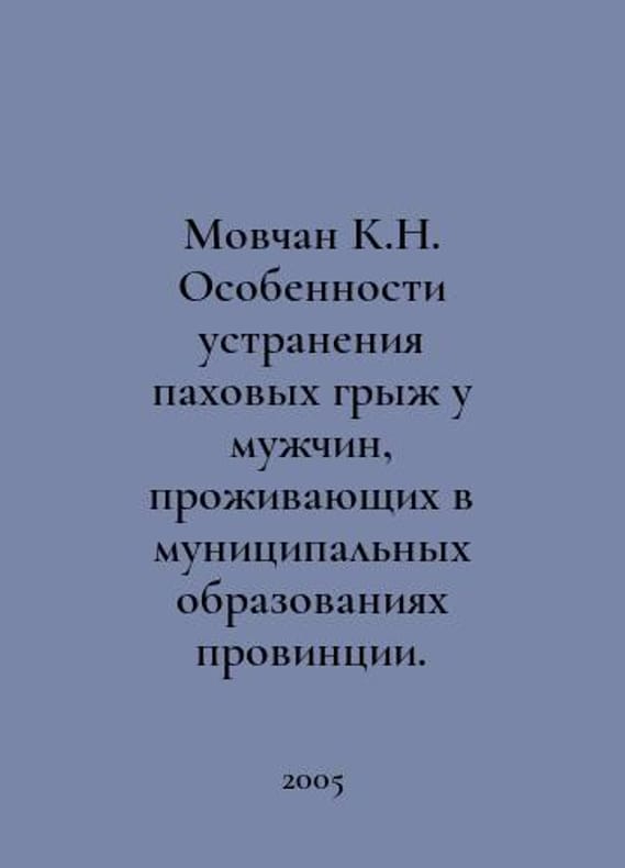 Movchan K.N. Peculiarities of removal of inguinal hernias in men living in municipalities of the province. In Russian /Movchan K.N. Osobennosti ustraneniya pakhovykh gryzh u muzhchin, prozhivayushchikh v munitsipalnykh obrazovaniyakh provintsii. K.N.Movchan, A.E.Borisov, S.E.Mitin, T.K.Kalantarov, T.V.Yakovenko, O.A.Grinenko.You are welcome to reach out to us for a detailed description of the copies currently available. Delivery of this book may take longer than usual including extended processing and pre-shipping time, no expedited shipping is available. Please advise us if you have a set date or a deadline to receive your order. SKUalb9507031b5444227f