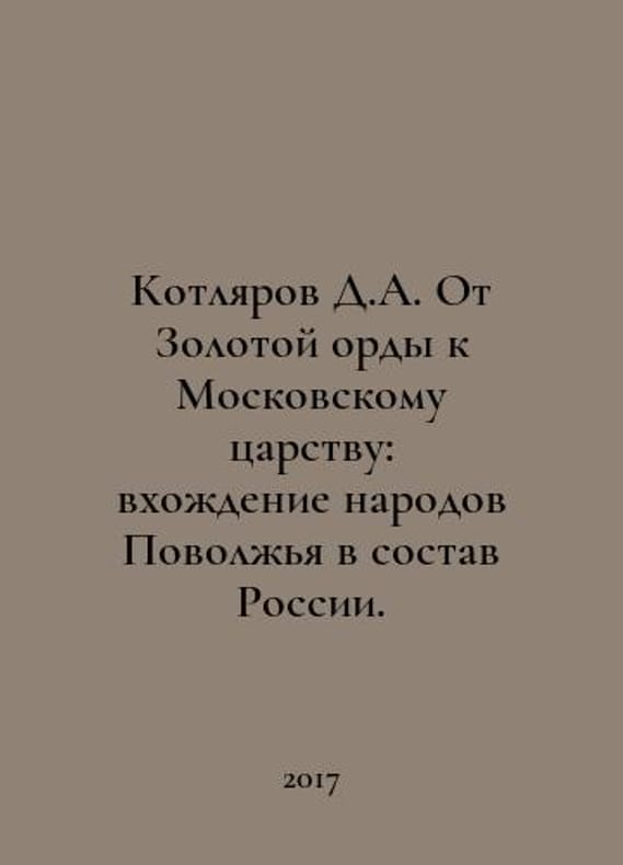 D. A. Kotlyarov From the Golden Horde to the Moscow Kingdom: the incorporation of the peoples of the Volga region into Russia. In Russian /Kotlyarov D. A. Ot Zolotoy Ordy k Moskovskomu tsarstvu: vkhozhdenie narodov Povolzhya v sostav Rossii. St. Petersburg Publishing House of Oleg Abyshko 2017. We have thousands of titles and often several copies of each title may be available. Please feel free to contact us for a detailed description of the copies available. SKUalb6f94533bd0315772.