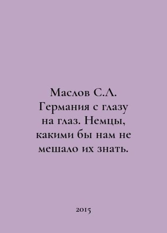 Maslov S.L. Germany face-to-face. Germans, no matter how much we know them. In Russian /Maslov S.L. Germaniya s glazu na glaz. Nemtsy, kakimi by nam ne meshalo ikh znat. Moscow. International Relations. 2015..You are welcome to reach out to us for a detailed description of the copies currently available. Delivery of this book may take longer than usual including extended processing and pre-shipping time, no expedited shipping is available. Please advise us if you have a set date or a deadline to receive your order. SKUalb97d25625cec76be3
