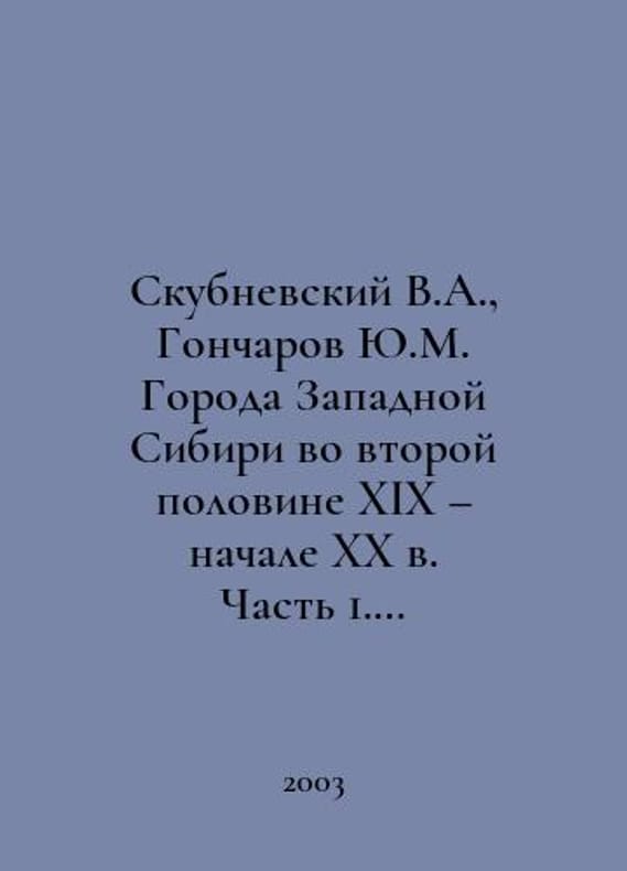 Skubnevsky V.A., Goncharov Yu.M. Cities of Western Siberia in the second half of the 19th and early 20th centuries. Part I: Population. Economy. In Russian /Skubnevskiy V.A., Goncharov Yu.M. Goroda Zapadnoy Sibiri vo vtoroy polovine XIX nachale XX v. Chast I: Naselenie. Ekonomika. Barnaul, Publishing House of Alt.un-ta, 2003. 360 p. We have thousands of titles and often several copies of each title may be available. Please feel free to contact us for a detailed description of the copies available. SKUalbe040906d1057495c.