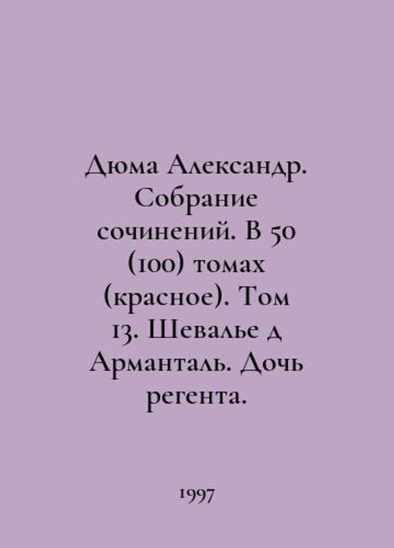 Dumas Alexandre. Collection of works. In 50 (100) volumes (red). Volume 13. Chevalier dArmanthal. Daughter of the Regent. In Russian /Dyuma Aleksandr. Sobranie sochineniy. V 50 (100) tomakh (krasnoe). Tom 13. Shevale d Armantal. Doch regenta. M. Art-Business Center. 1997. You are welcome to reach out to us for a detailed description of the copies currently available. Delivery of this book may take longer than usual including extended processing and pre-shipping time, no expedited shipping is available. Please advise us if you have a set date or a deadline to receive your order.SKUalb9b006a95273e5a05