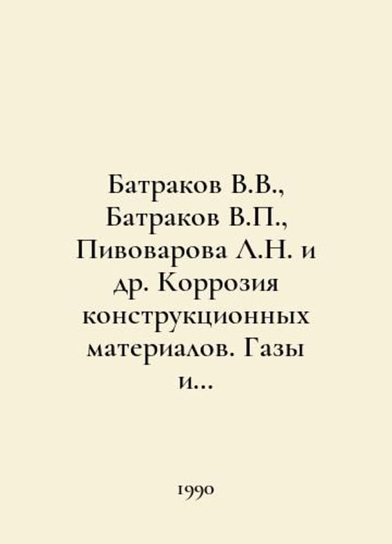 Batracov V.V., Batracov V., Pivovarova L.N. et al. Corrosion of structural materials. Gases and inorganic acids. In Russian /Batrakov V.V., Batrakov V., Pivovarova L.N. i dr. Korroziya konstruktsionnykh materialov. Gazy i neorganicheskie kisloty. Reference book. In two books. Book 2. Inorganic acids. Metallurgy 1990..You are welcome to reach out to us for a detailed description of the copies currently available. Delivery of this book may take longer than usual including extended processing and pre-shipping time, no expedited shipping is available. Please advise us if you have a set date or a deadline to receive your order. SKUalb9b708dca577ab77e