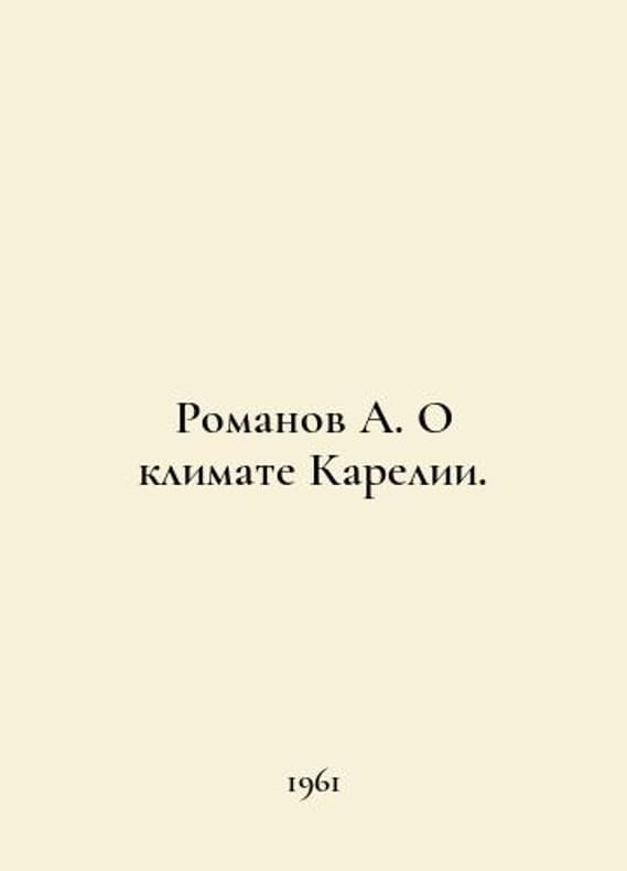 Romanov A. On the climate of Karelia. In Russian /Romanov A. O klimate Karelii. Izd.2 Petrozavodsk Karelia 1961..You are welcome to reach out to us for a detailed description of the copies currently available. Delivery of this book may take longer than usual including extended processing and pre-shipping time, no expedited shipping is available. Please advise us if you have a set date or a deadline to receive your order. SKUalb9c1cf553bf09d8e2