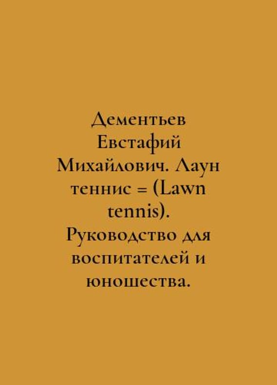 Dementiev Evstafy Mikhailovich. Lawn tennis. A guide for educators and young people. In Russian /Dementev Evstafiy Mikhaylovich. Laun tennis (Lawn tennis). Rukovodstvo dlya vospitateley i yunoshestva. Moscow Publishing House V. Sekachev 2021. 28s. You are welcome to reach out to us for a detailed description of the copies currently available. Delivery of this book may take longer than usual including extended processing and pre-shipping time, no expedited shipping is available. Please advise us if you have a set date or a deadline to receive your order.SKUalb9c25ccb45b605210