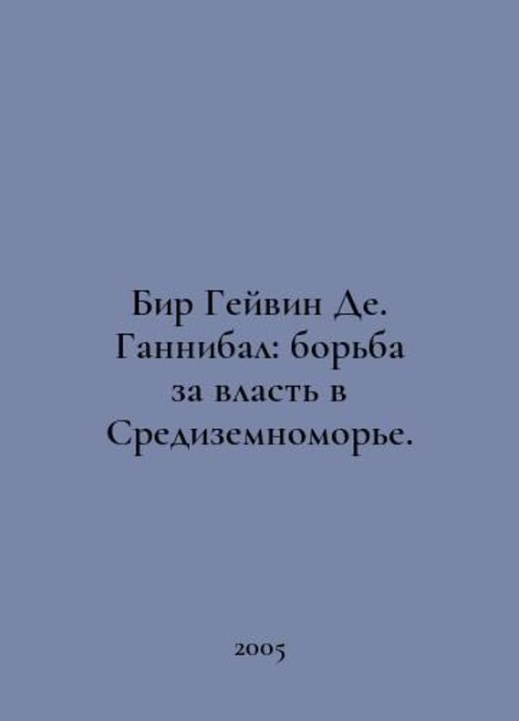 Beer Gavin De. Hannibal: The Struggle for Power in the Mediterranean. In Russian /Bir Geyvin De. Gannibal: borba za vlast v Sredizemnomore. The Popular Historical Library series Smolensk Rusich 2005. You are welcome to reach out to us for a detailed description of the copies currently available. Delivery of this book may take longer than usual including extended processing and pre-shipping time, no expedited shipping is available. Please advise us if you have a set date or a deadline to receive your order.SKUalba0e1df3272b7762d